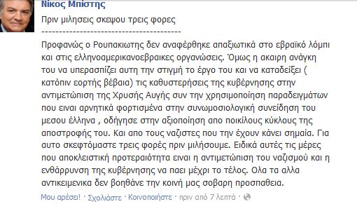 Τις δηλώσεις του Αντώνη Ρουπακιώτη σχολίασε πριν από λίγο στο Facebook, ο Νίκος Μπίστης.