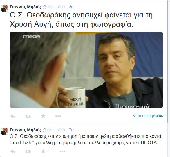 Αιχμές κατά του Σταύρου Θεοδωράκη άφησε ο Γιάννης Μηλιός μέσω Twitter.  «Ο Σ. Θεοδωράκης στην ερώτηση “με ποιον ηγέτη αισθανθήκατε πιο κοντά στο debate” για άλλη μια φορά μίλησε πολλή ώρα χωρίς να πει ΤΙΠΟΤΑ», έγραψε στο Τwitter ο υποψήφιος Ευρωβουλευτής του ΣΥΡΙΖΑ.