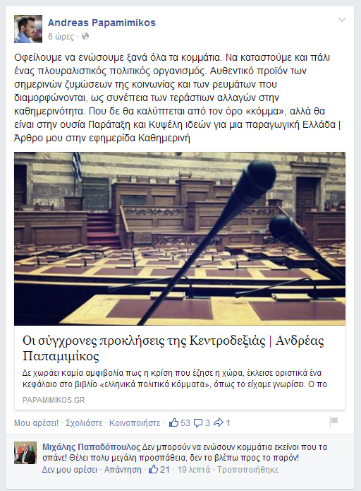 Ο κ. Παπαμιμίκος ανέβασε στο προφίλ του ένα απόσπασμα από άρθρο του στην Καθημερινή με τίτλο “Οι σύγχρονες προκλήσεις της Κεντροδεξιάς”.