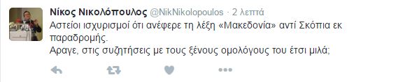 Συγκεκριμένα, ο κ. Νικολόπουλος έγραψε: «Αστείοι ισχυρισμοί ότι ανέφερε τη λέξη «Μακεδονία» αντί Σκόπια εκ παραδρομής. Άραγε, στις συζητήσεις με τους ξένους ομολόγους του έτσι μιλά;».