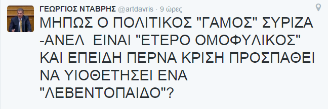 Μία ανάρτηση με υπονοούμενα έκανε στον προσωπικό του λογαριασμό στο Twitter ο πρώην βουλευτής Γιώργος Νταβρής, με “πρωταγωνιστή” τον Βασίλη Λεβέντη.