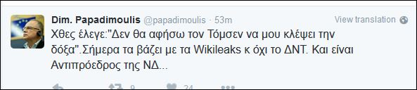 «Χθες έλεγε: “Δεν θα αφήσω τον Τόμσεν να μου κλέψει την δόξα”. Σήμερα τα βάζει με τα Wikileaks κ όχι το ΔΝΤ. Και είναι Αντιπρόεδρος της ΝΔ.», έγραψε ο ευρωβουλευτής του ΣΥΡΙΖΑ.