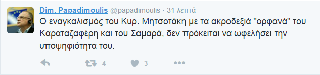 «Ο εναγκαλισμός του Κυριάκου Μητσοτάκη με τα ακροδεξιά “ορφανά” του Καραταζαφέρη και του Σαμαρά, δεν πρόκειται να ωφελήσει την υποψηφιότητα του», αναφέρει ο αντιπρόεδρος του ευρωπαϊκού κοινοβουλίου και ευρωβουλευτής του ΣΥΡΙΖΑ, Δημήτρης Παπαδημούλης, με ανάρτηση του στο Twitter, σχολιάζοντας τις συμμαχίες που θα υπάρξουν στον β΄γύρο των εκλογών της Νέας Δημοκρατίας.