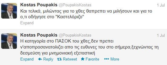 “Η κατηγορία στο ΠΑΣΟΚ του χθες, δεν πρεπει ν’αποπροσανατολίζει απο τις ευθύνες του στο σήμερα, ξεχνώντας τη δεσμεύση για μνημονιακή εξεταστική. Και τελικά, μιλώντας για το χθες θα πρεπει να μιλήσουν και για το ο,τι οδήγησε στο “Καστελόριζο”, είχε σημειώσει.