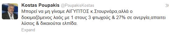 “Μπορεί να μη γίναμε Αίγυπτος κ.Στουρνάρα, αλλά ο δοκιμαζόμενος λαός με 1 στους 3 φτωχούς και 27% σε ανεργία, απαιτεί λύσεις και δικαιούται ελπίδα”, έγραψε ο κ. Πουπάκης στο Twitter.