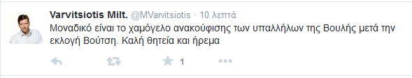Με έναν διαφορετικό τρόπο σχολίασε ο βουλευτής της Νέας Δημοκρατίας, Μιλτιάδης Βαρβιτσιώτης, την αλλαγή Προέδρου στη Βουλή με μήνυμά του στο Twitter.