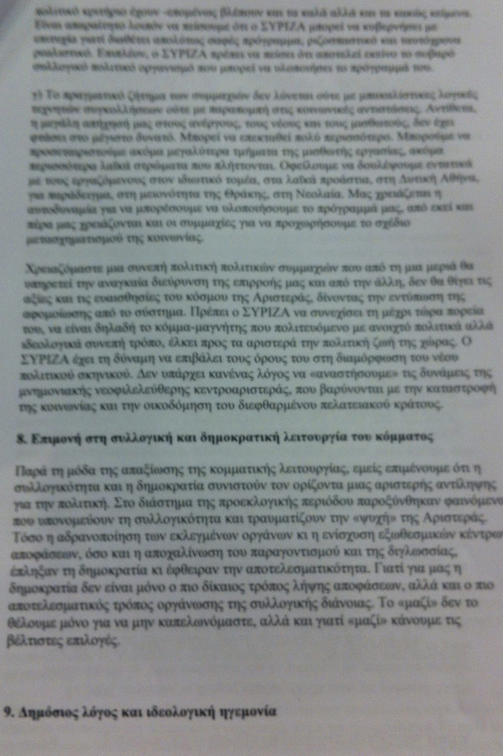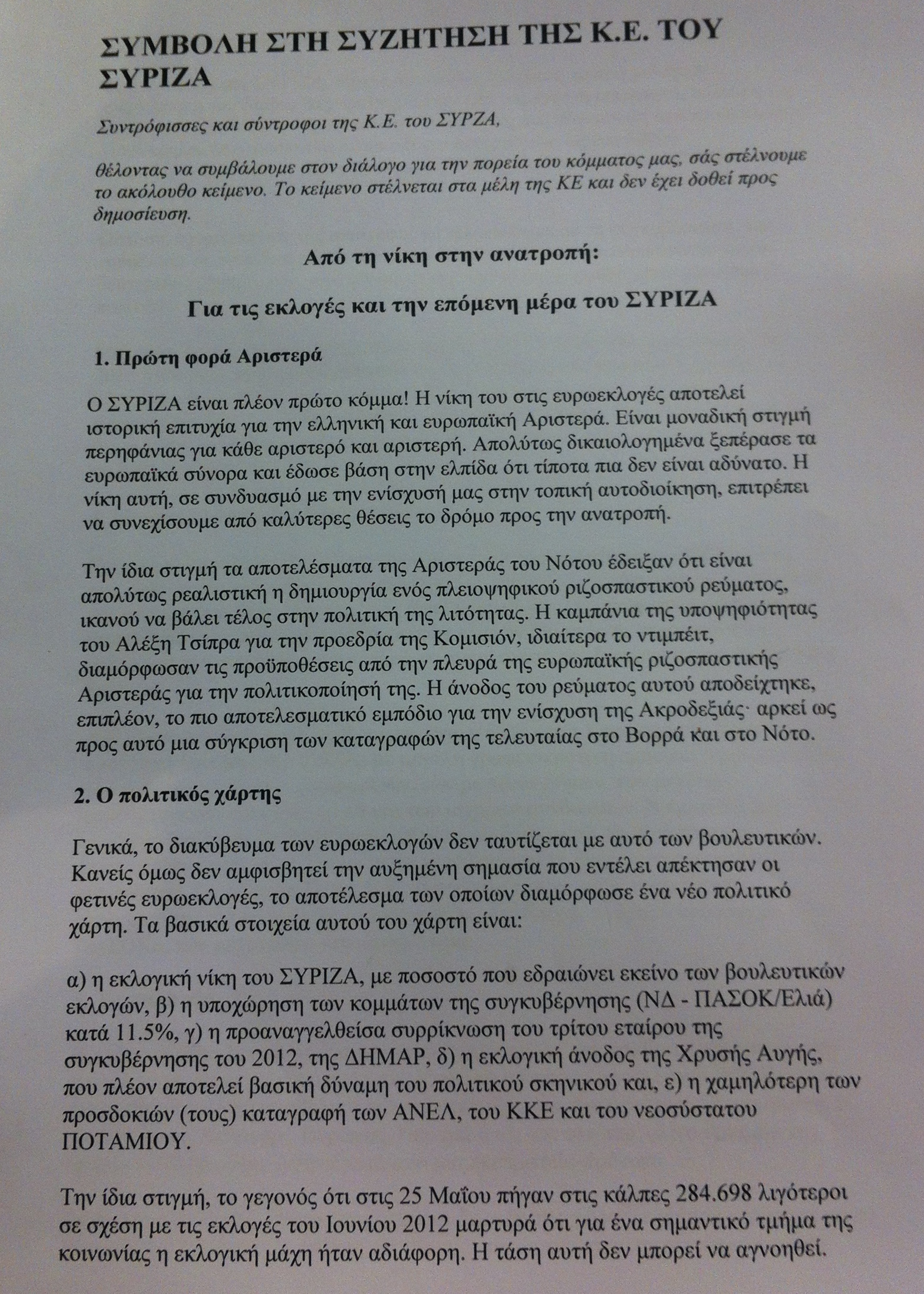 «Στο διάστημα της προεκλογικής περιόδου παροξύνθηκαν φαινόμενα που υπονομεύουν τη συλλογικότητα και τραυματίζουν την “ψυχή” της Αριστεράς. Τόσο η αδρανοποίηση των εκλεγμένων οργάνων κι η ενίσχυση εξωθεσμικών κέντρων αποφάσεων, όσο και η αποχαλίνωση του παραγοντισμού και της διγλωσσίας, έπληξαν τη δημοκρατία κι έφθειραν την αποτελεσματικότητα», αναφέρεται μεταξύ άλλων στο κείμενο.