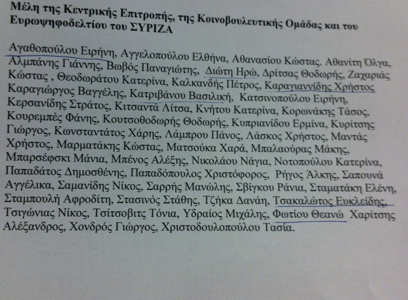 Αγαθοπούλου Ειρήνη, Αγγελοπούλου Ελθήνα, Αθανασίου Κώστας, Αθανίτη Όλγα, Αλμπάνης Γιάννης, Βωβός Παναγιώτης, Διώτη Ηρώ, Δρίτσας Θοδωρής, Ζαχαριάς Κώστας, Θεοδωράτου Κατερίνα, Καλκανδής Πέτρος, Καραγιαννίδης Χρήστος, Καραγιώργος Βαγγέλης, Κατριβάνου Βασιλική, Κατσινοπούλου Ειρήνη, Κερσανίδης Στράτος, Κιτσαντά Λίτσα, Κνήτου Κατερίνα, Κορωνάκης Τάσος, Κουρεμπές Φάνης, Κουτσοθοδωρής Θοδωρής, Κυπριανίδου Ερμίνα, Κυρίτσης Γιώργος, Κωνσταντάτος Χάρης, Λάμπρου Πάνος, Λάσκος Χρήστος, Μαντάς Χρήστος, Μαρματάκης Κώστας, Ματσούκα Χαρά, Μπαλαούρας Μάκης, Μπαρσέφσκι Μάνια, Μπένος Αλέξης, Νικολάου Νάγια, Νοτοπούλου Κατερίνα, Παπαδάτος Δημοσθένης, Παπαδόπουλος Χριστόφορος, Ρήγος Άλκης, Σαπουνά Αγγέλικα, Σαμανίδης Νίκος, Σαρρής Μανώλης, Σβίγκου Ράνια, Σταματακάκη Ελένη, Σταμπούλη Αφροδίτη, Στασινός Στάθης, Τζήκα Δανάη, Τσακαλώτος Ευκλείδης, Τσιγώνιας Νίκος, Τσίτσοβιτς Τόνια, Υδραίος Μιχάλης, Φωτίου Θεανώ, Χαρίτσης Αλέξανδρος, Χονδρός Γιώργος, Χριστοδουπούλου Τασία.