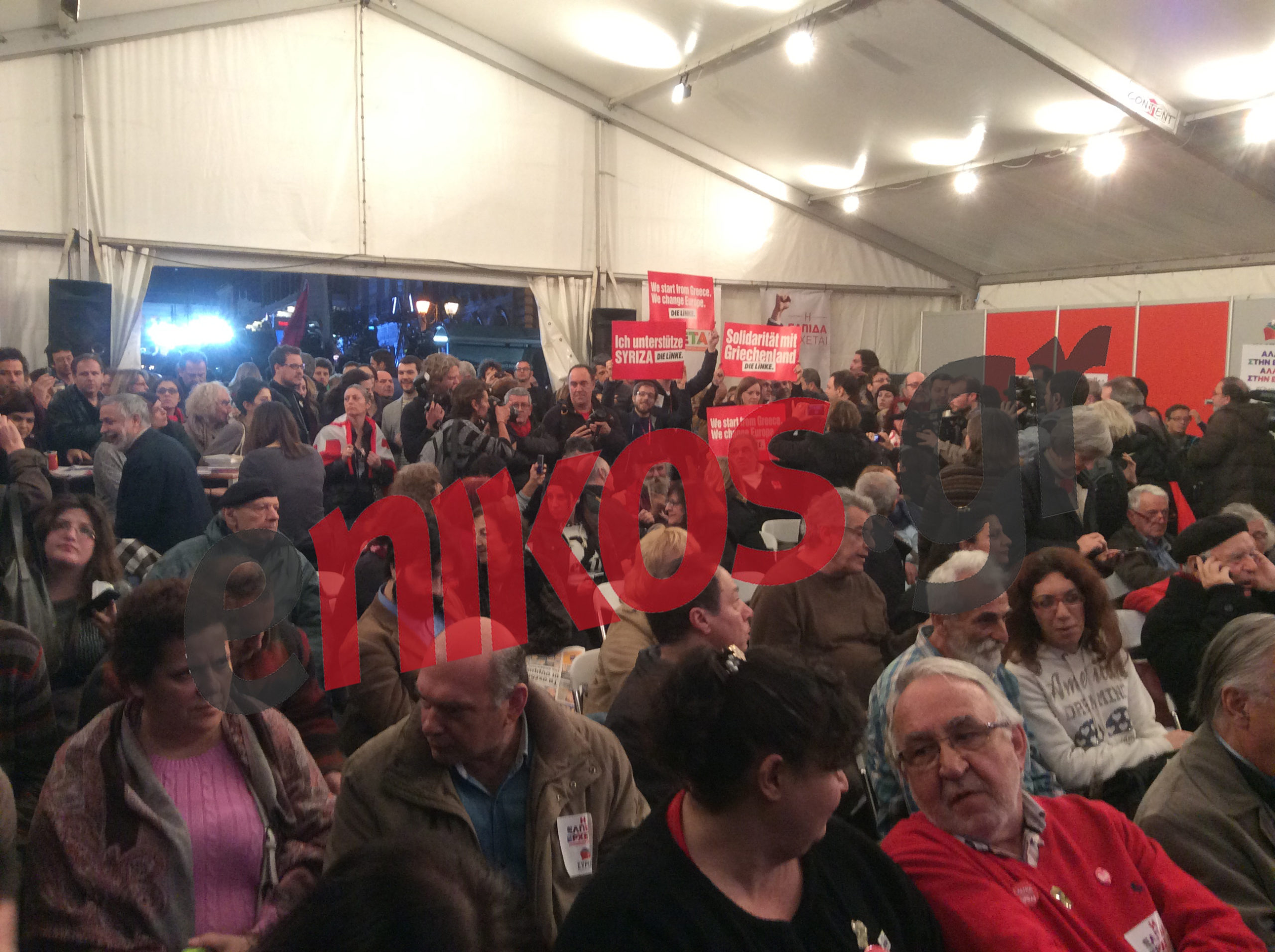 Στο εκλογικό κέντρο του ΣΥΡΙΖΑ στην Κλαυθμώνος παρακολουθούν υποστηρικτές του κόμματος τα πρώτα exit polls. Ανάμεσά τους και υποστηρικτές του γερμανικού κόμματος της αριστεράς, Die Linke.