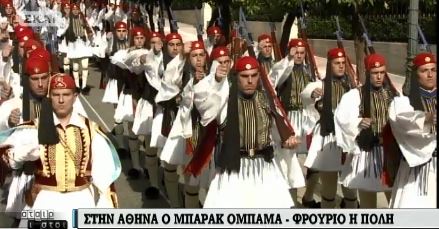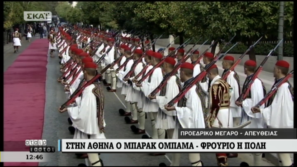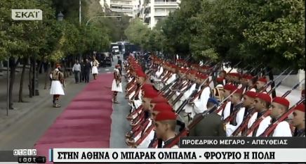 Το κόκκινο χαλί έχει στρωθεί έξω από το Προεδρικό Μέγαρο εκεί όπου σε περίπου μισή ώρα ο Αμερικανός Πρόεδρος Μπαράκ Ομπάμα θα γίνει δεκτός από τον Πρόεδρο της Δημοκρατίας Προκόπη Παυλόπουλο.