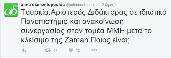 «Τουρκία: Αριστερός Διδάκτορας σε ιδιωτικό Πανεπιστήμιο και ανακοίνωση συνεργασίας στον τομέα ΜΜΕ μετά το κλείσιμο της Ζaman. Ποιος είναι;», έγραψε η κυρία Διαμαντοπούλου.