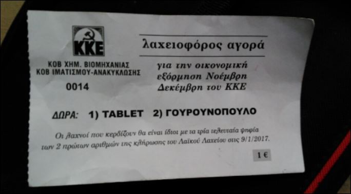 Παρότι δεν γνωρίζουμε τη γνησιότητα της φωτογραφίας, τη λαχειοφόρο αγορά φέρεται να διοργανώνουν οι ΚΟΒ Χημικής Βιομηχανίας και Ιματισμού – Ανακύκλωσης για την “οικονομική εξόρμηση Νοέμβρη-Δεκέμβρη του ΚΚΕ“