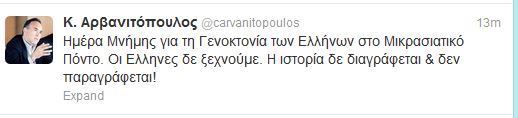 “Ημέρα Μνήμης για τη Γενοκτονία των Ελλήνων στο Μικρασιατικό Πόντο. Οι Ελληνες δε ξεχνούμε. Η ιστορία δε διαγράφεται και δεν παραγράφεται!” έγραψε στο λογαριασμό του στο Τwitter ο κ. Αρβανιτόπουλος.