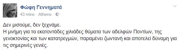 “Δεν μισούμε, δεν ξεχνάμε” σημειώνει η πρόεδρος του ΠΑΣΟΚ και επικεφαλής της Δημοκρατικής Συμπαράταξης, Φώφη Γεννηματά, σε μήνυμά της στα μέσα κοινωνικής δικτύωσης, για την Ημέρα Μνήμης της Γενοκτονίας των Ελλήνων του Πόντου.