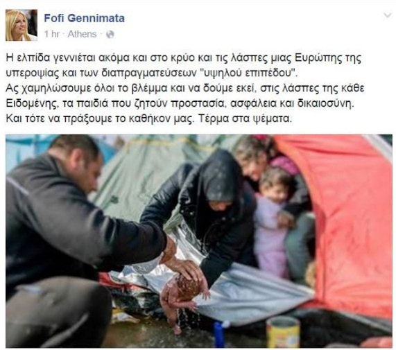 «Η ελπίδα γεννιέται ακόμα και στο κρύο και τις λάσπες μιας Ευρώπης της υπεροψίας και των διαπραγματεύσεων “υψηλού επιπέδου”. Ας χαμηλώσουμε όλοι το βλέμμα και να δούμε εκεί, στις λάσπες της κάθε Ειδομένης, τα παιδιά που ζητούν προστασία, ασφάλεια και δικαιοσύνη. Και τότε να πράξουμε το καθήκον μας. Τέρμα στα ψέματα» ήταν το μήνυμα που ανήρτησε στο λογαριασμό της η κ. Γεννηματά.