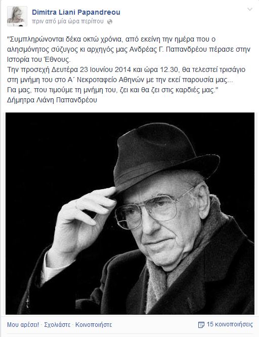 Σήμερα συμπληρώνονται 18 χρόνια από την ημέρα που “έφυγε” ο Ανδρέας Παπανδρέου. Δείτε τι έγραψε η Δήμητρα Λιάνη Παπανδρέου στο facebook: