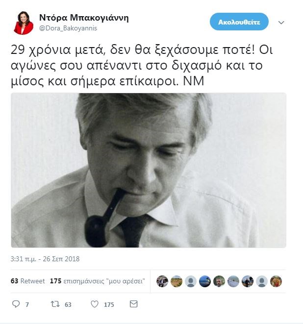“29 χρόνια μετά, δεν θα ξεχάσουμε ποτέ! Οι αγώνες σου απέναντι στο διχασμό και το μίσος και σήμερα επίκαιροι”, ανάρτησε στον προσωπικό της λογαριασμό στο twitter η βουλευτής της ΝΔ και πρώην Υπουργός Ντόρα Μπακογιάννη με αφορμή τη συμπλήρωση