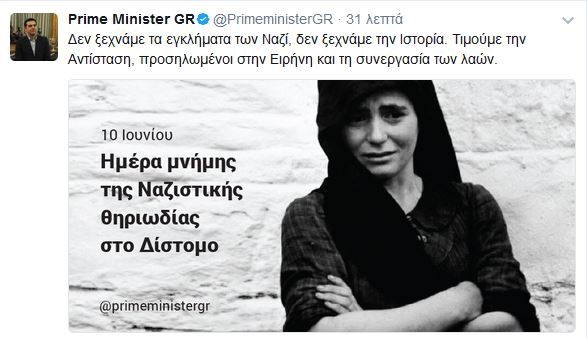 “Δεν ξεχνάμε τα εγκλήματα των ναζί, δεν ξεχνάμε την Ιστορία”, έγραψε στο Twitter ο Πρωθυπουργός Αλέξης Τσίπρας, για τη θηριωδία στο Δίστομο την 10η Ιουνίου 1944.