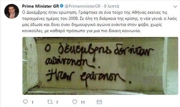 “O Δεκέμβρης ήταν ερώτηση. Γράφτηκε σε ένα τοίχο της Αθήνας εκείνες τις ταραγμένες ημέρες του 2008. Σε όλη τη διάρκεια της κρίσης, η νέα γενιά, ο λαός μας έδωσε και δίνει έναν δημιουργικό αγώνα ενάντια στον φόβο, χωρίς κουκούλες, με καθαρό πρόσωπο για μια πιο δίκαιη κοινωνία”.