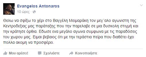 «Θέλω να σφίξω το χέρι στον Βαγγέλη Μεϊμαράκη τον μεγάλο αγωνιστή της Κεντροδεξιάς μας παράταξης που την παρέλαβε σε μια δύσκολη στιγμή και την κράτησε όρθια», έγραψε στον προσωπικό του λογαριασμό στο Facebook, ο εκπρόσωπος της κυβέρνησης Καραμανλή, Ευάγγελος Αντώναρος.