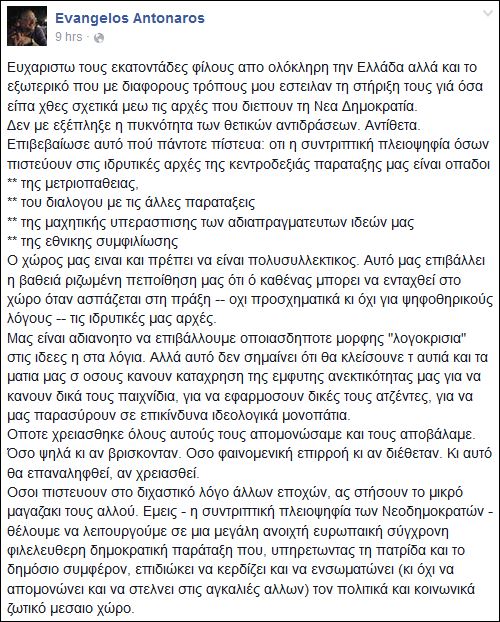 Μήνυμα στους ψηφοφόρους της Νέας Δημοκρατίας στέλνει με ανάρτηση στον προσωπικό του λογαριασμό στο Facebook ο Ευάγγελος Αντώναρος αφήνοντας αιχμές για τις εξελίξεις στο εσωτερικό του κόμματος.