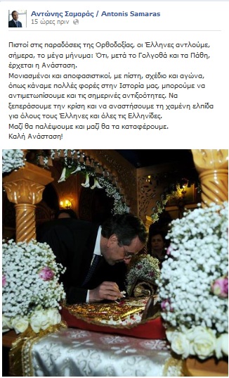 Ο πρόεδροςτης Νέας Δημοκρατίας, Αντώνης Σαμαράς, έγραψε στο facebook:«Πιστοί στις παραδόσεις της Ορθοδοξίας, οι Έλληνες αντλούμε, σήμερα, το μέγα μήνυμα: Ότι, μετά το Γολγοθά και τα Πάθη, έρχεται η Ανάσταση.Μονιασμένοι και αποφασιστικοί, με πίστη, σχέδιο και αγώνα, όπως κάναμε πολλές φορές στην Ιστορία μας, μπορούμε να αντιμετωπίσουμε και τις σημερινές αντιξοότητες. Να ξεπεράσουμε την κρίση και να αναστήσουμε τη χαμένη ελπίδα για όλους τους Έλληνες και όλες τις Ελληνίδες.Μαζί θα παλέψουμε και μαζί θα τα καταφέρουμε.Καλή Ανάσταση!»