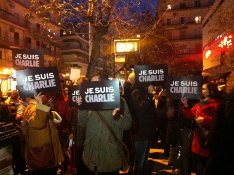 Ο Γιάννης Μπουτάρης όπως και οι υπόλοιποι Θεσσαλονικείς κρατά ένα μαύρο πλακάτ που αναγράφει «Je suis Charlie».