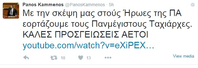 Μήνυμα μέσω Twitter έστειλε ο Πάνος Καμμένος με αφορμή τον εορτασμό του προστάτη της Πολεμικής Αεροπορίας Αρχάγγελου Μιχαήλ.