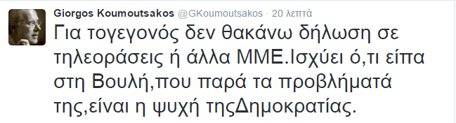 «Για το γεγονός δεν θα κάνω δήλωση σε τηλεοράσεις ή άλλα ΜΜΕ. Ισχύει ό,τι είπα στη Βουλή, που παρά τα προβλήματά της, είναι η ψυχή της Δημοκρατίας», συμπλήρωσε με δεύτερη ανάρτηση του ο κ. Κουμουτσάκος.