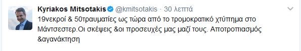 “19 νεκροί και 50 τραυματίες ως τώρα από το τρομοκρατικό χτύπημα στο Μάντσεστερ. Οι σκέψεις και οι προσευχές μας μαζί τους. Αποτροπιασμός και αγανάκτηση.”, έγραψε στο Twitter ο Πρόεδρος της Νέας Δημοκρατίας, Κυριάκος Μητσοτάκης για την πολύνεκρη επίθεση στο Μάντσεστερ.