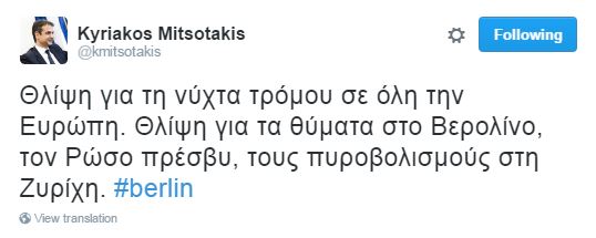 “Θλίψη για τη νύχτα τρόμου σε όλη την Ευρώπη. Θλίψη για τα θύματα στο Βερολίνο, τον Ρώσο πρέσβυ, τους πυροβολισμούς στη Ζυρίχη. #berlin”, ήταν το μήνυμα του προέδρου της ΝΔ.