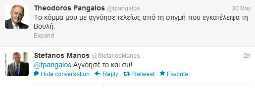Ποτέ δεν έκρυψαν στο παρελθόν ότι…μιλούσαν, άλλωστε υπήρξε και περίοδος που έκαναν μαζί ραδιοφωνική εκπομπή πριν τις εκλογές του 2009. Χθες ο Θεόδωρος Πάγκαλος έγραψε στο twitter, το παράπονό του για την “συμπεριφορά” του ΠΑΣΟΚ. Σήμερα ο Στέφανος Μάνος του απάντησε: