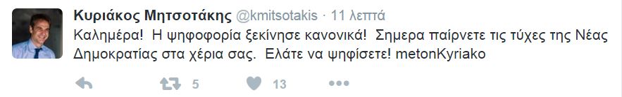 Ο κ. Μητσοτάκης έγραψε: «Καλημέρα. Η ψηφοφορία ξεκίνησε κανονικά. Σήμερα παίρνετε τις τύχες της Νέας Δημοκρατίας στα χέρια σας. Ελάτε να ψηφίσετε.»