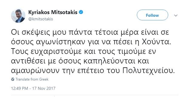 “Οι σκέψεις μου πάντα τέτοια μέρα είναι σε όσους αγωνίστηκαν για να πέσει η Χούντα. Τους ευχαριστούμε και τους τιμούμε εν αντιθέσει με όσους καπηλεύονται και αμαυρώνουν την επέτειο του Πολυτεχνείου”, έγραψε ο κ. Μητσοτάκης.