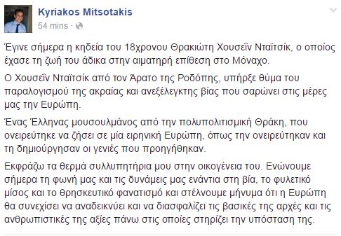 O πρόεδρος της ΝΔ, μέσω του λογαριασμού του στο Facebook επεσήμανε ότι «ο Χουσεΐν Νταϊτσίκ από τον Άρατο της Ροδόπης, υπήρξε θύμα του παραλογισμού της ακραίας και ανεξέλεγκτης βίας που σαρώνει στις μέρες μας την Ευρώπη».