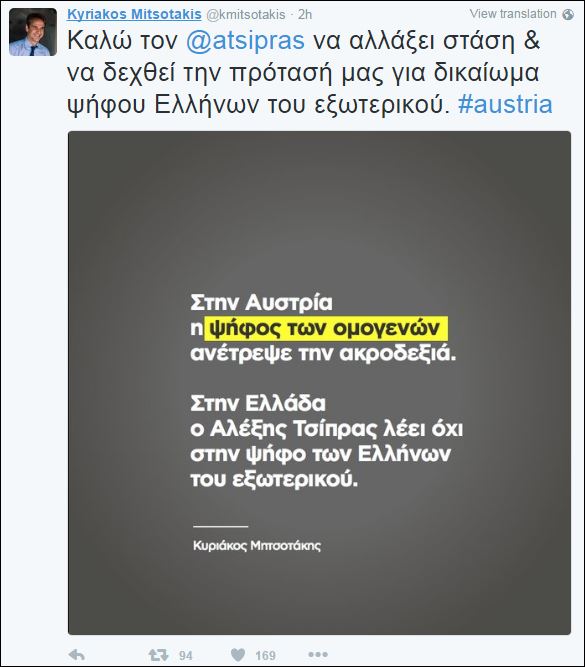 «Καλώ τον Αλέξη Τσίπρα να αλλάξει στάση και να δεχθεί την πρότασή μας για δικαίωμα ψήφου Ελλήνων του εξωτερικού», αναφέρει η ανάρτηση του κ. Μητσοτάκη, ενώ στην φωτογραφία που τη συνοδεύει αναγράφεται το εξής: «Στην Αυστρία η ψήφος των ομογενών ανέτρεψε την ακροδεξιά. Στην Ελλάδα ο Αλέξης Τσίπρας λέει όχι στην ψήφο των Ελλήνων του εξωτερικού».