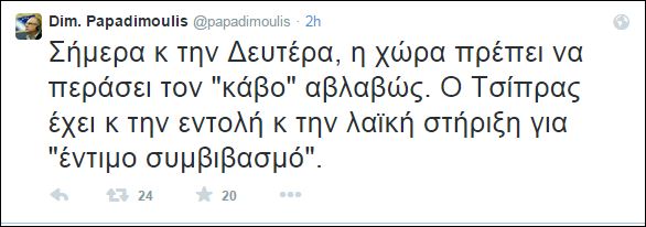 «Σήμερα κ την Δευτέρα, η χώρα πρέπει να περάσει τον “κάβο” αβλαβώς. Ο Τσίπρας έχει κ την εντολή κ την λαϊκή στήριξη για “έντιμο συμβιβασμό”», αναφέρει το «τιτίβισμα» του αντιπροέδρου του Ευρωπαϊκού Κοινοβουλίου.