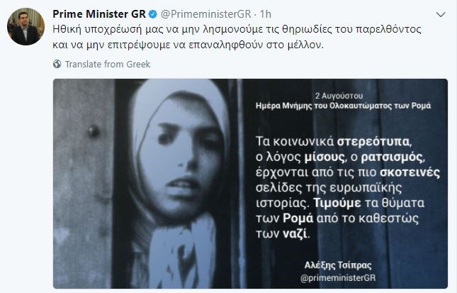 «Είναι ηθική υποχρέωσή μας να μην λησμονούμε τις θηριωδίες του παρελθόντος και να μην επιτρέψουμε να επαναληφθούν στο μέλλον” τονίζει ο Πρωθυπουργός Αλέξης Τσίπρας σε ανάρτησή του στο twitter με αφορμή την Ημέρας Μνήμης του Ολοκαυτώματος των Ρομά.