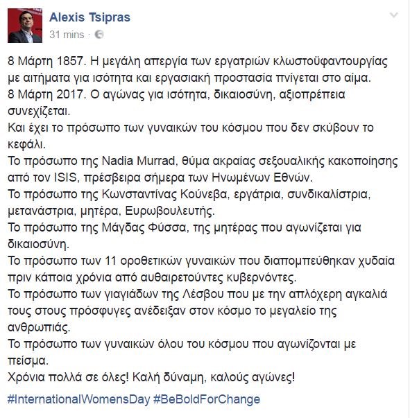Μήνυμα για τη σημερινή Ημέρα της Γυναίκας έστειλε ο Πρωθυπουργός Αλέξης Τσίπρας με ανάρτησή του στο Facebook.O κ. Τσίπρας αναφέρθηκε στους διαχρονικούς αγώνες των γυναικών για ισότητα, δικαιοσύνη, αξιοπρέπεια και σε γυναίκες από ολόκληρο τον κόσμο που αγωνίστηκαν για τα δικαιώματά τους. «Χρόνια πολλά σε όλες! Καλή δύναμη, καλούς αγώνες» κατέληξε ο Πρωθυπουργός.Ολόκληρη η ανάρτηση του κ. Τσίπρα:”8 Μάρτη 1857. Η μεγάλη απεργία των εργατριών κλωστοϋφαντουργίας με αιτήματα για ισότητα και εργασιακή προστασία πνίγεται στο αίμα.