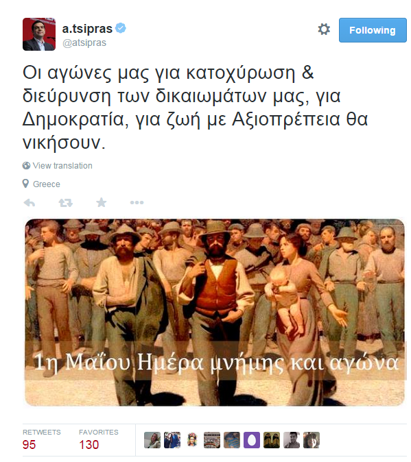 «Οι αγώνες μας για κατοχύρωση & διεύρυνση των δικαιωμάτων μας, για Δημοκρατία, για ζωή με Αξιοπρέπεια θα νικήσουν» αναφέρει ο πρωθυπουργός, Αλέξης Τσίπρας, σε μήνυμά του για την ημέρα της Πρωτομαγιάς, που ανάρτησε στον προσωπικό του λογαριασμό στο Twitter.