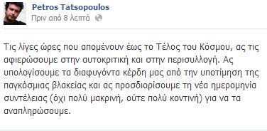 O Πέτρος Τατσόπουλος έστειλε μέσω του Facebook το δικό του μήνυμα ενόψει του τέλους του κόσμου που πλησιάζει.