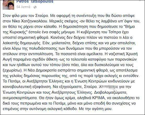 «Στον φίλο μου τον Σταύρο. Με αφορμή τη συνέντευξη που θα δώσει απόψε στον Νίκο Χατζηνικολάου. Μερικές σκέψεις -αν θέλει τις λαμβάνει υπ΄όψιν του, αν θέλει τις ρίχνει στον κάλαθο. Η δημοσκόπηση που δημοσίευσε το “Βήμα της Κυριακής” έστειλε ένα σαφές μήνυμα. Η κυβέρνηση του Τσίπρα έχει υποστεί σημαντική φθορά. Κανένας δεν δείχνει πλέον να πιστεύει τι λέει ο λαϊκιστής δημαγωγός. Εάν, μολαταύτα, δείχνει επίσης και να μην απειλείται, είναι λόγω της πολυδιάσπασης των δυνάμεων που θα μπορούσαν να τον στείλουν στην αντιπολίτευση. Τα ποσοστά είναι αμείλικτα. Η ναζιστική Χρυσή Αυγή παραμένει σχεδόν άθικτη -ως το τελευταίο καταφύγιο των παρανοϊκών και των ηλιθίων αυτού του τόπου (όσο πάει, όλο και δυσκολεύομαι να τους ξεχωρίσω). Η Νέα Δημοκρατία εισπράττει σημαντική φθορά, ως αποτέλεσμα της γελοίας δημόσιας παρουσίας της, από τις παρά τρίχα εκλογές κι εντεύθεν. Το Ποτάμι, οι Ανεξάρτητοι Έλληνες και η Ένωση Κεντρώων κινδυνεύουν με κοινοβουλευτική εξαφάνιση. Να εξηγούμαστε, Σταύρο. Χ@@@@@@@ε για την Ένωση Κεντρώων και τους Ανεξάρτητους Έλληνες. Διαβολομαζώματα, ανεμοσκορπίσματα. Θα ήταν όμως κρίμα, αληθινά ΚΡΙΜΑ, να ακολουθήσει το δικό τους πεπρωμένο και το Ποτάμι, μόνο και μόνο επειδή θα συνεχίσεις να επιμένεις στην αυτόνομη εκλογική κάθοδο. Με την αγάπη μου».