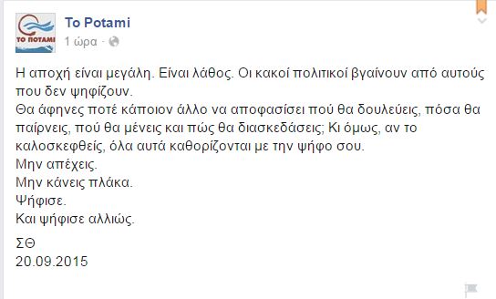 Συγκεκριμένα έγραψε στη σελίδα που διατηρεί το Ποτάμι στο Facebook: