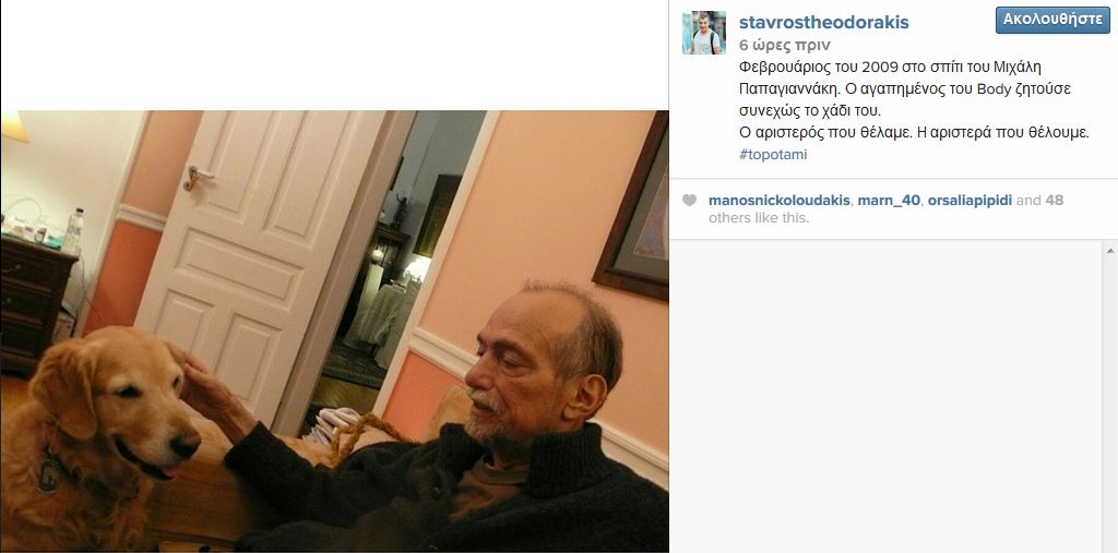 «Φεβρουάριος του 2009 στο σπίτι του Μιχάλη Παπαγιαννάκη. Ο αγαπημένος του Body ζητούσε συνεχώς το χάδι του. Ο αριστερός που θέλαμε. Η αριστερά που θέλουμε», έγραψε στον προσωπικό του λογαριασμό στο Instagram, ο επικεφαλής του Ποταμιού, Σταύρος Θεοδωράκης, για τη συμπλήρωση έξι χρόνων από το θάνατο του ιστορικού στελέχους της Αριστέρας.