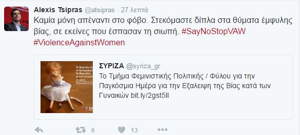«Ενώνουμε τη φωνή μας με τα θύματα έμφυλης βίας» αναφέρει σε μήνυμά του στο twitter, ο Πρωθυπουργός Αλέξης Τσίπρας, με αφορμή την Παγκόσμια Ημέρα για την εξάλειψη της Βίας κατά των Γυναικών και υπογραμμίζει: