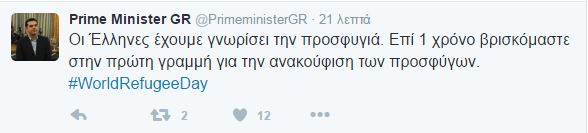 «Οι Έλληνες έχουμε γνωρίσει την προσφυγιά. Επί 1 χρόνο βρισκόμαστε στην πρώτη γραμμή για την ανακούφιση των προσφύγων”, έγραψε ο Πρωθυπουργός, Αλέξης Τσίπρας, στον Twitter, με αφορμή την Παγκόσμια Ημέρα Προσφύγων.