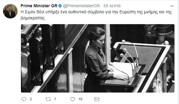«Η Σιμόν Βέιλ υπήρξε ένα αυθεντικό σύμβολο για την Ευρώπη της μνήμης και της Δημοκρατίας» αναφέρει ο πρωθυπουργός Αλέξης Τσίπρας, σε ανάρτησή του στο Twitter, με αφορμή τον θάνατο της Γαλλίδας πολιτικού και πρώτης γυναίκας προέδρου του Ευρωπαϊκού Κοινοβουλίου.