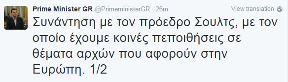 Με ανάρτηση του στο twitter o κ. Τσίπρας επισημαίνει ότι «με τον πρόεδρο Σουλτς, έχουμε κοινές πεποιθήσεις σε θέματα αρχών που αφορούν στην Ευρώπη».