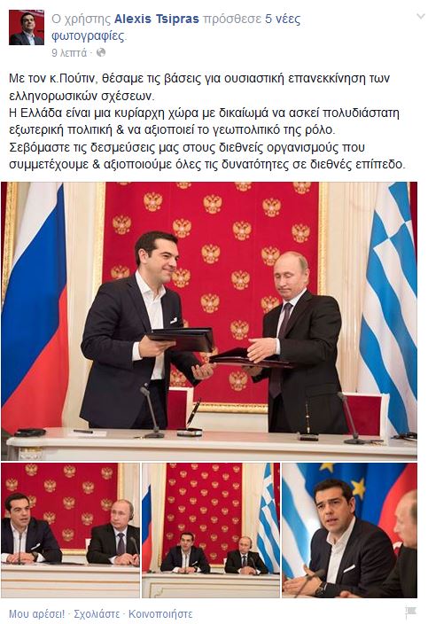 Ανάρτηση στο facebook έκανε ο Αλέξης Τσίπρας μετά τη συνάντηση με τον Βλαντιμίρ Πούτιν.