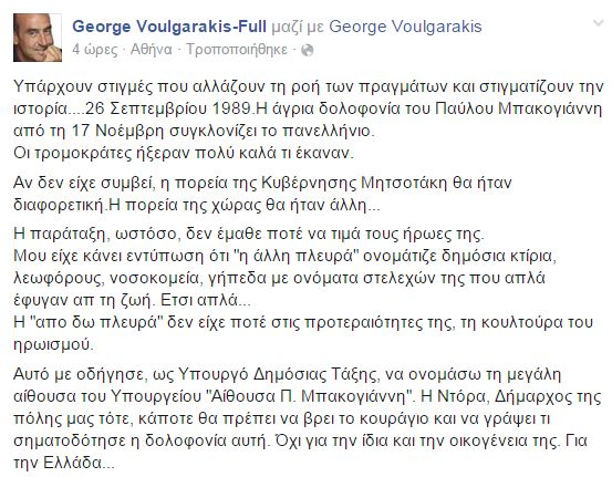 Μήνυμα για τα 26 χρόνια που συμπληρώνονται από την ημέρα της δολοφονίας του Παύλου Μπακογιάννη από την τρομοκρατική οργάνωση “17 Νοέμβρη”, έστειλε ο Γιώργος Βουλγαράκης, με ανάρτηση του στο Facebook. Αναλυτικά έγραψε: